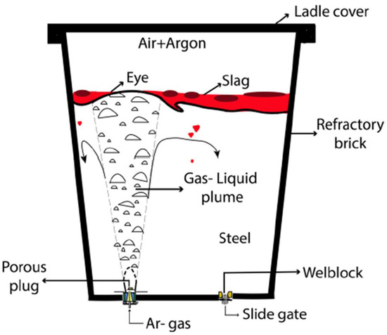 Due to the rising need for high-quality steel products, ladle metallurgy, a secondary steelmaking process, has attracted a lot of attention over time. Ladle metallurgy is practiced by adjusting a steel’s composition, cleanliness, and temperature over wide ranges to meet diverse plant and customer requirements. The technique involves a series of different steps after tapping liquid steel into a teeming ladle and before sending it to the caster. These steps include de-oxidation, composition adjustment, temperature control, degassing, cleanliness adjustments, etc. Depending upon the final grade of steel, the steelmaking professional must select different operations wisely. However, all secondary steelmaking operations have one thing in common: the injection of inert gas into the steel melt using one or more porous plugs installed in the bottom brickwork of a ladle. Since argon (Ar) gas has zero solubility in steel and is inert by nature, it is frequently used for purging a melt to ensure temperature and composition homogeneity as well as to encourage reactions that lead to the refining of the steel through slag–metal interactions. Many studies have also confirmed that argon gas injection can aid in inclusion removal.