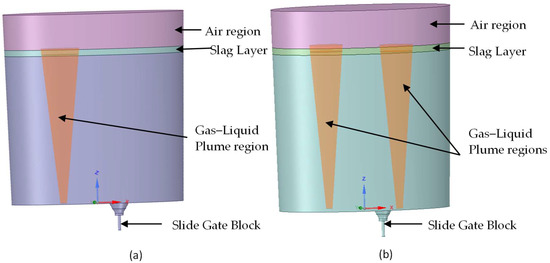 For the VOF multiphase model, all four phases (liquid steel, slag, argon, and air) were considered. The same geometries and meshes were used, as shown in Figure 2, after ignoring the plume region. The height of the air region was considered as 609 mm, and the slag layer thickness was kept at 106 mm as per the industrial setup. The details of material properties used in the mathematical model are shown in Table 2. To replicate the actual plant process, the density of argon gas is taken, corresponding to a temperature around 1100 °C [24].