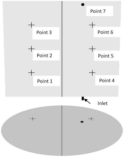 In Equation (14), r represents the radial distance, and θ represents the angle formed with the major axis. The major and minor axes are denoted by a and b, respectively. Based on calculations, the existing plug was located at an angle of 38.2 degrees, at a half radius from the center of the ellipse. Using this as a reference point, six additional positions were identified at angles of 60, 120, and 180 degrees from the reference point and at distances of 0.5 and 0.75 times the radius from the center. The calculated positions are summarized in Table 3, while the locations of the plugs at the bottom of the ladle are illustrated in Figure 3. In Figure 3, Point 0 represents the location of the existing plug and Points 1–6 denote different proposed positions for the second plug. The corresponding cases selected for questioning are presented in Table 4.