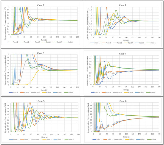 Tracer concentration curves for Cases 1, 2, 3, 4, 5, and 6 for six locations selected within the ladle.