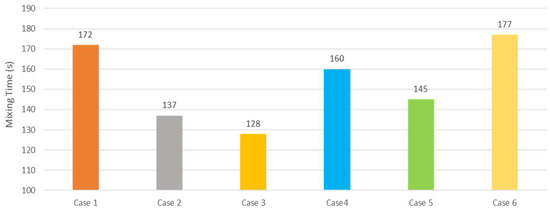 Figure 5 shows the tracer concentration curves at various monitoring points for all the cases studied: Cases 1, 2, 3, 4, 5, and 6 are shown. Additionally, Figure 6 shows the overall mixing times for each case. It was determined that Case 3 (i.e., dual-plug configuration with plugs placed diametrically opposite each other, at half radius) provided the shortest mixing time, although Case 2 was a very close second.