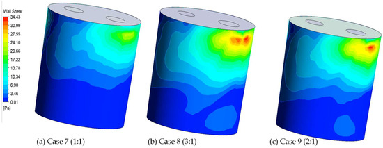 The results of this exercise showed that Case 8 (3:1) had the shortest mixing time of the three studied. However, it is crucial to also consider other significant variables, such as the lining life in the inevitable presence of refractory lining wear. In this regard, Figure 9 illustrates a comparative plot of hydrodynamic wall shear stresses generated for the three cases. It can be observed that for the same total argon injection rate, Case 7 has a much lower detrimental effect on the wall’s erosion than the other two cases.