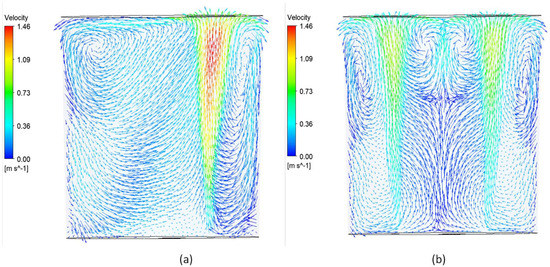 Figure 10 depicts the flow patterns for the single-plug and dual-plug systems, with the velocity vector plotted on a vertical plane passing through the center of the plug and the center of the ladle (plane A in Figure 8). In the case of a single-plug configuration, two typical recirculation fluid flow patterns can be observed between the plume region and the ladle wall generated by argon injection. The size of the recirculation loop depends on the radial distance between the plug and the ladle sidewall. The recirculation flow can be characterized by an upward flow driven by injected gas, which then turns horizontally towards the sidewall in the vicinity of the free surface and, finally, into a downward flow along the sidewall. It should be noted that the plume shape is not strictly vertical conical; it is slightly tilted towards the nearest wall with increasing height in the ladle. In contrast, the flow profile for a dual-plug arrangement exhibits an additional recirculation loop between two plumes, along with two large recirculations between the plume and ladle wall. Since the gas flow rate is the same in both plugs, the flow pattern is nearly symmetrical. These figures show that the predicted results align well with the theoretical understanding of plume formation during argon injection into a ladle [7]. Due to gas injection, the gas–liquid region of both plumes expands laterally with increasing liquid height, causing the plume to split into two primary streams. Additionally, both plume shapes are slightly tilted toward the nearest ladle wall.