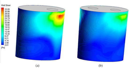 Predicted wall shear for (a) single-plug and (b) dual-plug configurations (Case 3).
