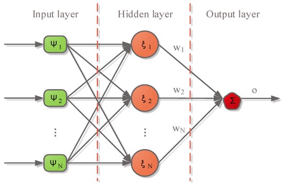 When analyzing the stability of the Lyapunov function, needs to be considered. The problem in the design of the above DTC system is that linear partitioning is not possible. A radial basis function neural network (RBFNN) can approach any nonlinear function, has an excellent generalization ability and learning speed, and easily deals with the problem of impossible linear partitioning in low dimensions [22]. The principle of an RBFNN is as follows. By using the radial basis function as the activation function of a neural network, the neural network can map the input data nonlinearly and better adapt to the complex relationships within or between the data. Compared with traditional activation functions such as sigmoid and ReLU, the radial basis function has better smoothness and locality so it can better fit the local characteristics of data. This outer diameter basis function also has good scalability and interpretability, which can provide interpretability for the output of a neural network and aid in the decision-making process of the neural network. The structure of an RBFNN is shown in Figure 1.