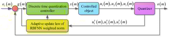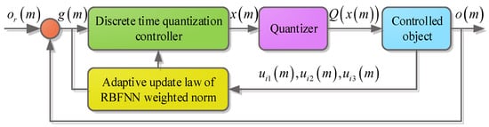 in Equation (8) represents the Gaussian function. The training methods of the RBFNN are mainly divided into two categories: linear least squares (LLS) and orthogonal least squares (OLS). The LLS method can minimize the sum of squares of errors between the output and input of the network. The OLS rule is to construct an orthogonal matrix by rotating the input and output coordinate systems into mutually orthogonal coordinate systems and then use the least squares method to solve the eigenvectors and eigenvalues of the matrix. By selecting the least squares solution to train the neural network, the ideal model output can be obtained. Although the computational complexity of the OLS method can further improve the stability and generalization ability of neural network models compared with the LLS method, this study chose the OLS method as the training method for the RBFNN. The control system used in this study is a DTC system. The signal between the controller and the system is transmitted through the network medium with limited bandwidth. The transmission of digital signals is not limited by broadband and can effectively suppress noise, optimizing the anti-interference performance of the DTC system [23]. At present, the commonly used non-uniform quantizers include the hysteresis quantizer and the logarithmic quantizer. The logarithmic quantizer can quantize signals of different sizes with different quantization intervals. This makes the system need less information to reach a stable state and occupy less network bandwidth, so it is widely used. However, in the control process, the logarithmic quantizer generates buffeting signals. To avoid buffeting, the hysteresis quantizer is selected. The hysteresis quantizer has an additional quantization level. When the output is converted from one value to another, it passes a certain dwell time before the new conversion, which can effectively reduce chattering [24]. The hysteresis quantizer at time is shown in Figure 2.