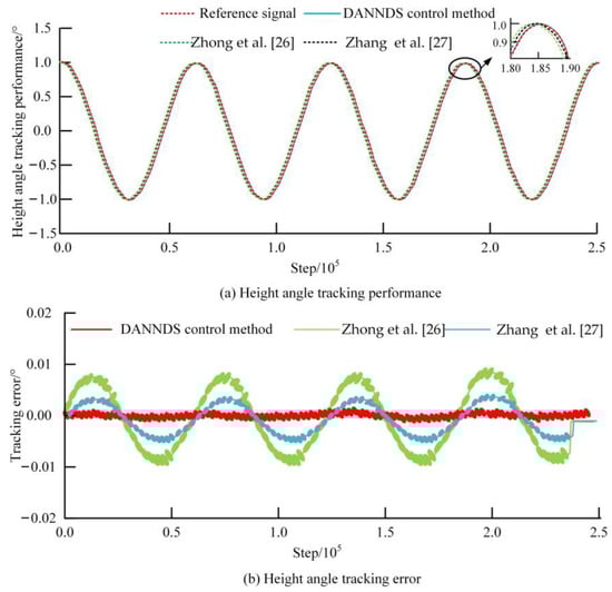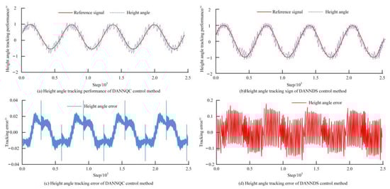 Height angle tracking performance and tracking error change curve of DANNDS control method and DANNQC control method.