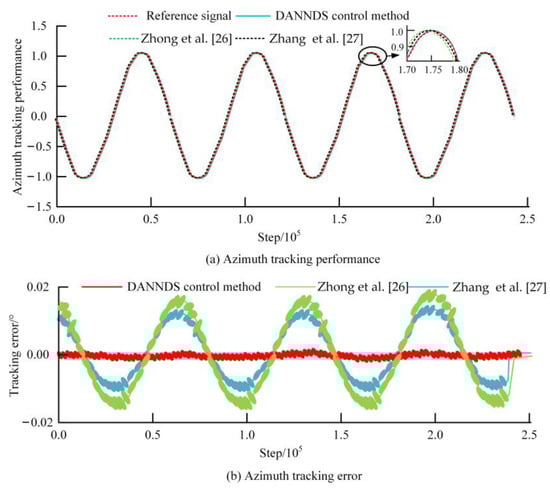 Figure 6 shows the azimuth tracking performance and tracking error results of the three control methods. Figure 6a shows the variation curves of the azimuth tracking performance of the three control methods. As the step size increases, the tracking performance of the three methods shows periodic variation curves, and the DANNDS control method is more in line with the change in the reference signal. The variation curves of the other two control methods have a certain gap with the curve of the reference signal. This indicates that the proposed method can more efficiently track changes in solar light. According to Figure 6b, as the step size increases, the tracking error of the DANNDS control method changes slightly, ranging within [−0.003,0.003]. The tracking error curve of the control method proposed in the literature [26] shows periodic fluctuations with a large amplitude. The control method designed in the literature [27] has the maximum tracking error, with a range of variations within [−0.17,0.017]. In summary, the tracking effect and performance of the DANNDS control method are superior to those of the other two mainstream control methods.