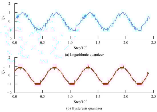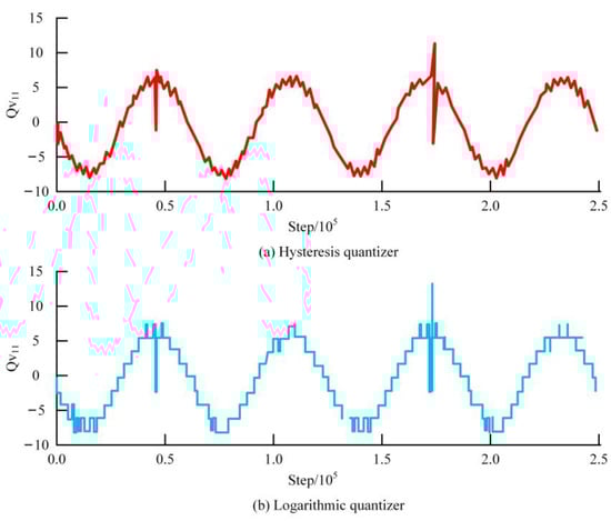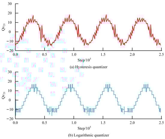 Figure 7 shows the variation curves of the height angle quantization control signals for the two quantization methods, wherein random interference signals were introduced at steps 0.4 × 105 and 1.7 × 105. The variation curves of the two methods exhibit the same periodic variation, with logarithmic quantization within the range of [−20,20] and more frequent fluctuations. The hysteresis quantification method proposed in this study varies with step size within the range of [−8,8], and the fluctuations are smoother. At the two points where the random interference signals were introduced, the proposed hysteresis quantizer can better alleviate the adverse effects caused by the introduction of random interference.