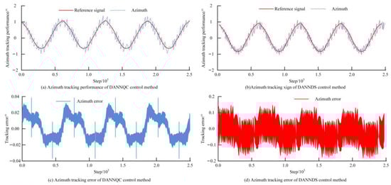 Figure 10 shows the azimuth tracking performance and tracking error change curve for the DANNQC control method. Figure 10a shows the azimuth tracking performance change curve for the DANNQC control method, which fits well with the reference signal, and the change range is [−1.2,1.1]. Figure 10b shows the azimuth tracking performance change curve for the DANNDS control method, within the range of [−1.2,1.2]. As can be observed in Figure 10c, as the step size increases, the azimuth tracking error for the DANNQC control method presents periodic changes, and the range of these changes is [−0.03,0.03]. Figure 10d shows the azimuth tracking error for the DANNDS control method, which fluctuates frequently and varies in the range of [−1.8,1.8]. In conclusion, the control performance of the DANNQC control method is superior.