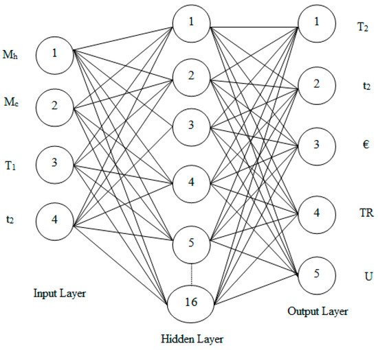 Heat exchanger parameters were represented by four neurons in the input layer, and responses were represented by five neurons in the output layer. The optimal number of neurons and hidden layers in the hidden layer were determined using trial and error in the MATLAB software. For training, we obtained an MSE of 0.03, and for testing, we obtained an MSE of 0.015. In this BPNN network, the egress and hidden layers were activated by purelin and tansig, respectively. The training function was Levenberg–Marquardt (trainlm), and the stopping criteria were 10,000, 0.001, 0.00001, and 1000, respectively, for the maximum epoch number, the performance goal, and the minimum performance gradient.