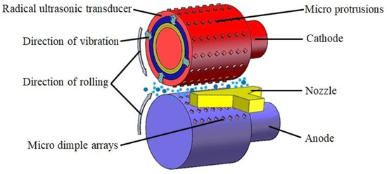 In RUREMM, the cathode includes an ultrasonic transducer with micro-protrusions on its surface, while a cylindrical workpiece made of SS304 serves as the anode, as illustrated in Figure 1. The ultrasonic transducer (cathode) and the workpiece (anode) are clamped on different spindles of the machine tool, respectively, which has the same linear velocity during machining. The conductive electrolyte is pumped into the machining zone by the nozzle, serving as the medium [37]. Micro-dimples are formed on the workpiece surface when the power is connected, and the radial ultrasonic transducer produces an array of micro protrusions that vibrate to assist in the machining process.