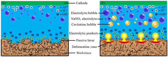 Figure 2a demonstrates the anodic dissolution pits formed on the surface of the anode with varying depths. These pits result in a decrease in surface roughness and the accumulation of electrolytic products. In contrast, Figure 2b shows that ultrasonic cavitation initiates a chain reaction of cavitation bubbles that collapse and break the passive layer on the workpiece surface. This results in the formation of plastic micro-pits and micro-jets on the metal surface, along with convex peaks surrounding the pits in the machining gap. As a result, the plastic peaks serve to amplify the impact of the electric field in the machining gap, leading to a smoother and better surface finish [39].