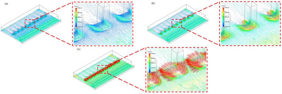 Velocity vector of the flow field. (a) EMM, (b) RUREMM (upward vibration), (c) RUREMM (downward vibration).