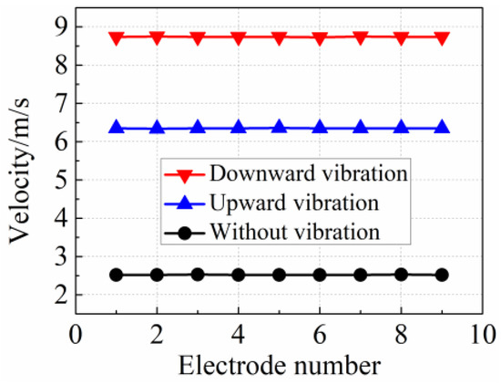 According to Figure 5, the variation in flow field velocity within the machining gap is depicted. When there is no vibration, the velocity of the electrolyte experiences an increase of approximately 152.0% and 246.8%, ranging from 2.52 m/s to almost 6.35 m/s, and 8.74 m/s when the cathode rapidly moves both upward and downward. Based on these results, it can be inferred that the flow rate of the electrolyte in the machining gap is substantially improved through the introduction of the ultrasonic energy field, which can promptly renew the electrolyte, and thus significantly enhance machining accuracy.