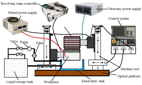 Figure 6 shows a schematic view of the experimental equipment. The experimental configuration comprises the ultrasonic generation system, electrolyte recycle, pulse power supply, and the machine tool control system. The ultrasonic transducer is a crucial component of the ultrasonic generation system. It converts electrical energy into ultrasonic waves; the ultrasonic waves cause the tool to vibrate radially, which helps to improve the efficiency and effectiveness of the electrochemical machining process. A radical vibration transducer with micro protrusion on its outside surface is used as the cathode, which is fixed on the different revolving stage. The electrolyte module provides the electrolyte solution at a specific pressure that can be adjusted using valves, pumps, and filters. This system effectively controls the velocity and flow of the electrolyte solution within the processing loop. Power supply units supply the machining current at different parameters: voltage and duty ratio (USIMU, TP3030). The computer system precisely controls the motion of the XYZ axes connected to three servomotors through a motion control card. In addition, a high-speed camera (Keyence, VW6000) is applied to detect the machining gap. This ensures that the inter-electrode gap is maintained within specified tolerances, resulting in accurate and efficient electrochemical machining.