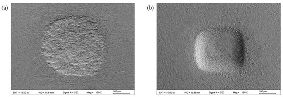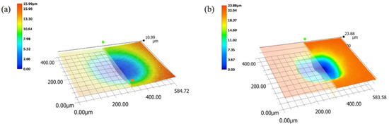 To compare the localization and stability of workpieces machined using EMM and RUREMM, a series of basic experiments were conducted. The ultrasonic amplitude is 10 μm and the pulse voltage is 10 V, as shown in Figure 7 and Figure 8. The morphology and dimensions of the machined array dimples were analyzed using two different techniques: scanning electron microscopy (SEM) (Hitachi, Regulus 8100) and optical profiler (KLA, Zeta-300). In the field of electrochemical micromachining (EMM), it is observed that the surface of micro-dimples often has blurred boundaries with the rough bottom. This is because the electrochemical process can result in uneven removal of material from the surface, leading to an irregular shape of the dimple. Based on the micro-dimples processed using RUREMM, as shown in Figure 7b andFigure 8b, it seems that there is a more uniform corrosion on the surface of the micro-dimples. This might be because RUREMM combines the benefits of rotary ultrasonic machining and electrochemical machining, resulting in a more uniform and controlled material removal. Moreover, the absence of any unremoved material in the central area of the dimple indicates that the machining process is more precise and controlled. Overall, RUREMM shows promise as a micromachining technique for producing high quality micro-dimples with improved surface quality and dimensional accuracy.