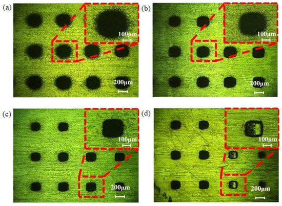 Figure 13 and Figure 14 show the morphology and the relationship between pulse voltage and dimensions of the array micro-dimples, respectively, under different pulse voltage during EMM and RUREMM. During the RUREMM, the phenomenon of the stray corrosion decreases, and the fringing is clearer with higher surface precision as the pulse voltage increases. The change of pulse voltage has little influence on the width of the dimples, and EMM and RUREMM have a similar variation in the same working conditions.