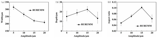 Effects of ultrasonic amplitude on array dimple dimensions during RUREMM. (a) Width, (b) depth, (c) aspect ratio.