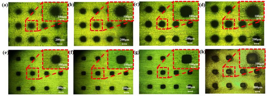 Morphology of array micro-pits under different pulse voltage, EMM: (a) 6 V, (b) 8 V, (c) 10 V, (d) 12 V, RUREMM: (e) 6 V, (f) 8 V, (g) 10 V, (h) 12 V.