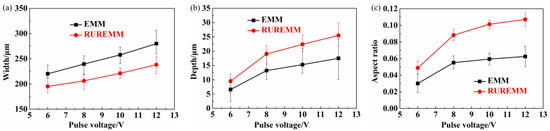 Effects of pulse voltage on array dimple dimensions during EMM and RUREMM. (a) Width, (b) depth, (c) aspect ratio.