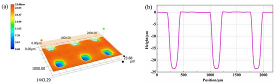 The micro-dimple arrays with good performance were generated by the optimized parameters, as shown in Figure 15. Furthermore, 3D morphology of micro-pits and the cross-sectional profile curve were obtained through optical profiling during RUREMM, as shown in Figure 16. The analysis reveals that the average width is 215.8 μm, depth is 23.6 μm, aspect ratio is 0.1094 μm, and the roughness of the smooth surface is 0.218 μm, confirming the effectiveness of the selected parameters.