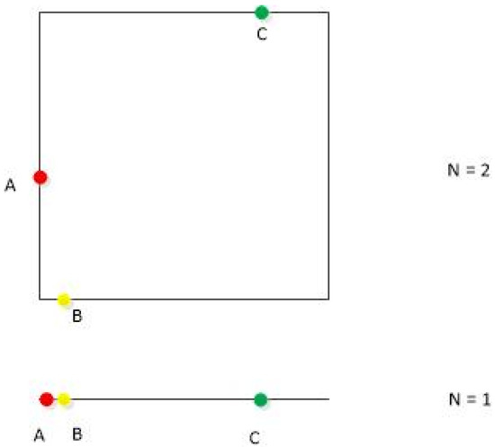 As shown in Figure 1, when the dimension is 1, points A, B and C seem to be neighbors as a consequence of projecting into a space of smaller dimensions. However, when the dimension reaches 2, point B becomes separated from A and C. The idea of the FNN algorithm is that neighboring points that are squeezed together by low dimensions cease to be neighboring points as the dimensions increase. The FNN algorithm defines these points as false nearest neighbors. For a time series, when all false nearest neighbors disappear, the determined dimension can lead to information that is neither redundant nor deficient, and this dimension is the best dimension.