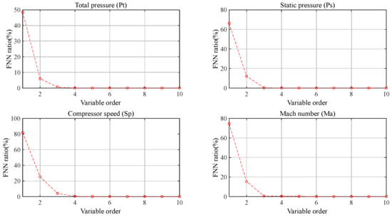 The order of the variables selected for a model will directly affect the accuracy of prediction. A selected low order can lead to incomplete data information and the inability to accurately predict the Mach number, while a selected excessively high order will lead to information redundancy, which will cause too much noise in the model and prevent achieving a fast control. Therefore, the order of the variables should be determined scientifically through algorithms. The commonly used methods to determine the order of variables include the correlation integral (CI) approach [23], the singular value decomposition (SVD) approach [24] and the false nearest neighbor (FNN) approach [25]. The CI approach needs a large sample size and can be easily influenced by noise. The SVD approach is suitable for linear systems but not for nonlinear systems. The FNN approach measures the ability of original features to interpret category variables. Based on the above considerations, the FNN approach was chosen to determine the order of the variables.