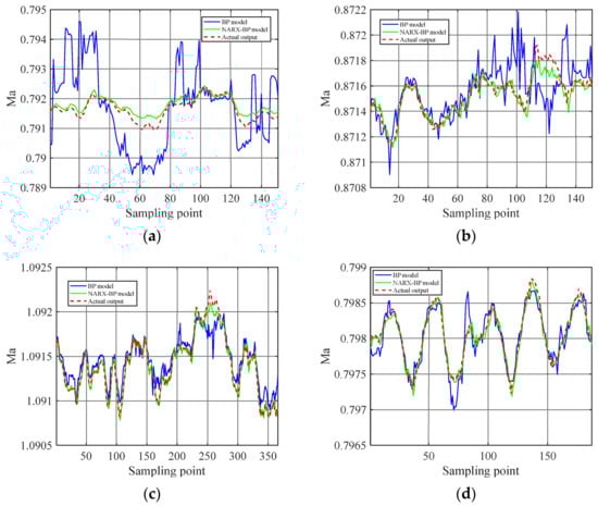 Prediction curves of the Mach number of the NARX-BP model and BP model. (a) Working condition 1; (b) working condition 2; (c) working condition 3; (d) working condition 4.