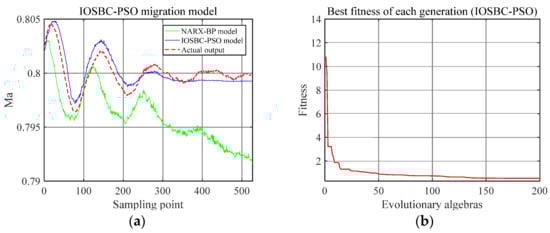 Simulation results using the IOSBC-PSO and NARX-BP models. (a) Prediction curves of the Mach number of the NARX-BP model and IOSBC-PSO migration model; (b) Fitness curve of the IOSBC-PSO migration model.
