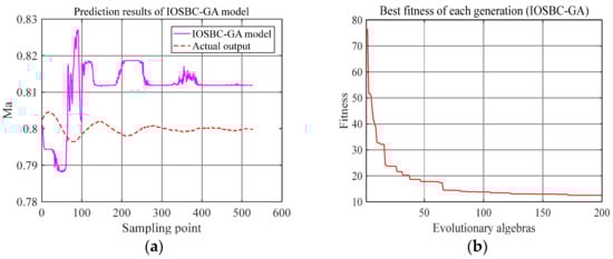 It can be seen in Figure 6a and Figure 7a that the Mach number predicted by the IOSBC-PSO model was closer to the actual Mach number than those predicted by the IOSBC-GA model and the NARX-BP model. According to Figure 6b and Figure 7b, the fitness convergence of the PSO model was better than that of the GA model, indicating that the prediction ability of the PSO model was better.