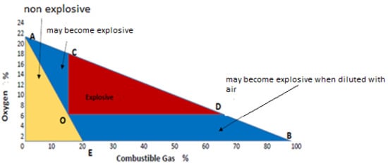 Coal mines all across the world are at risk of gas explosions. Reducing deaths and property loss through emergency response is crucial [12]. People may suffocate to death when there is an excessive amount of methane in the air. When the temperature inside a coal mine reaches a certain level, the coal will spontaneously ignite, but because there isn’t enough oxygen there, the combustion won’t be complete and a lot of CO will be produced, which is very attractive to haemoglobin [13]. Methane gas is released during the extraction of coal and when it comes in contact with oxygen at a certain level, they become explosive in nature (Figure 2). The Coward explosive triangle diagram, which Coward and Jones published in 1952, has been accepted as a quick and simple method to assess the gas mixture’s explosibility. In simple terms, three characteristic points define the explosive triangle. The diagram is divided into four distinct zones labeled as the impossible mixing zone, the explosive zone, the not-explosive zone (but could become explosive with the addition of more combustibles or air), and another non-explosive zone. The Coward explosive triangle diagram is shown in Figure 2 [14].
