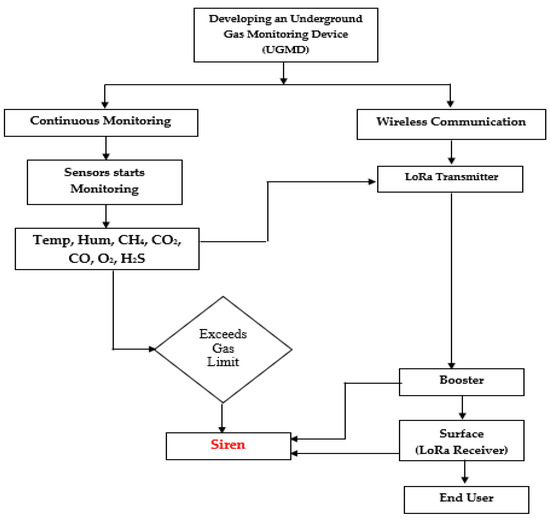 The proposed Underground Gas Monitoring Device (UGMD) system plays an important role in monitoring mine gases and transmitting information to the surface. As part of this work, a system that continuously monitors the concentrations of O2, CH4, CO, CO2, and H2S, as well as the temperature and humidity in underground coal mines near the work area, was developed. The same data is then simultaneously transmitted to the surface via a long-range (LoRa) wireless communication system. If the concentration of any gas except Oxygen exceeds the allowable limit and the amount of O2 in particular, decreases below the limit as specified by the user, an alarm system is immediately activated in the UGMD, Booster and surface system, and the concerned higher authorities take necessary measures to prevent unexpected situations. The developed UGMD must follow certain guidelines established by the Directorate General of Mine Safety (DGMS). This UGMD system aims to provide continuous gas monitoring through sensors and simultaneously transmit data effectively through a LoRaWAN communication system and enable voice/beep alerts to workers and authorities as shown in Figure 4.