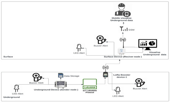 The developed UGMD system continuously monitors the concentrations of various gases and simultaneously transmits the data to the surface. If the concentration of any gas exceeds the permissible limit, it immediately triggers an alarm. This functionality is achieved using a microcontroller application. This UGMD system uses teensy 3.2 microcontrollers, which are faster and have a built-in 3.3 V voltage regulator [40]. The Teensy 3.2 is a small development board with a 32-bit 72 MHz ARM Cortex-M4 processor [41]. The Teensy processor has direct access to a USB port to help load code from desktops/laptops to the developed system. All 62 I/O channels can trigger an interrupt and operate at 3.3 V with 5 V tolerance [41]. The developed UGMD has gas monitoring sensors, a LoRa transmitter, a buzzer, an LED, and an SD card connected to the microcontroller, and the surface device has a microcontroller, a LoRa receiver, a buzzer, and an LED. Boosters are connected between the UGMD and the surface system at regular optimized intervals to amplify the signal. Figure 5 displays the architecture.