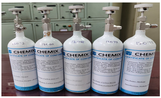 The gases were procured from the gas manufacturer in separate canisters. The capacity of each canister is 0.5 AL which contained 1 kg of gas in compressed form. The gases procured were Methane, Carbon monoxide, Carbon dioxide, Oxygen, and Hydrogen Sulphide with purity of 99.5%, 99.5%, 99.9%, 99.85%, and 99.9% respectively which are shown in Figure 7.