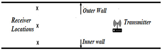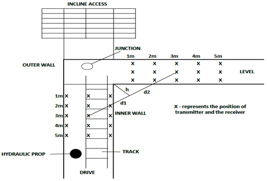 All the tests used a LoRa receiver that transmitted and received at 433 MHz. The transmission power of this system is 10 dBm. A LoRa transmitter and receiver equipped with a helical antenna is used to measure RSSI and SNR. In an underground mine model, line-of-sight measurements were taken. The mine model has dimensions of around 2.2 m × 2.4 m. Three measurements were taken across the drive and level with the transmitter positioned at a 2 m height. Three measurements were taken at the outer wall, the centre, and the inner wall as shown in Figure 8.