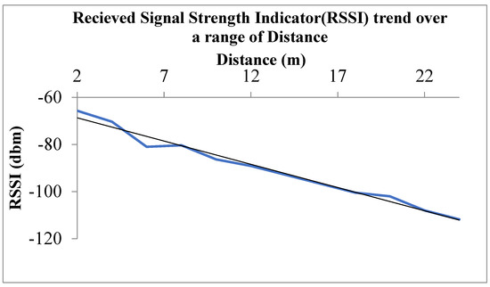 As already stated, the key factor in path loss modelling is the path loss exponent n. When RSSI dB is plotted versus various distances, the path loss exponent is indicated by the slope of the line. ‘n’ is calculated by averaging all measurements made from 1 to 20 m at interval of 1 m. A total of 3 measurements for a spreading factor of 7 at each distance have been taken. It is found that the curve fits well to the straight line and slope of the line is −1.97. Therefore, 1.97 is the exponent of the path loss. Given that the free space path loss exponent is 2, it may be concluded that longer distances in the underground experience less loss than they would in free space. The typical RSSI plotted against distance is shown in Figure 9.