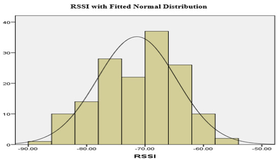 The RSSI varies at various locations along the drive at the same distance because of the constructive and destructive interference brought on by multipath fading. Diffraction, absorption, and interference are some of the external factors that can affect radio waves and induce changes to the RSSI [45,46,47,48]. This led to the study of RSSI variations over the drive at each distance. In the measurements, a lognormal distribution with a standard deviation of 6.79 dB describes well the variability in RSSI. A histogram of the variation across all samples is shown in Figure 10. These variations were calculated by subtracting the mean of RSSI of the 3 measurements at each distance, from each samples, which resulted in total of 180 samples. The histogram is superimposed on a normal distribution of sample variance calculated from the measurements. It is observed that distribution of the samples is well represented by the distribution of variation.