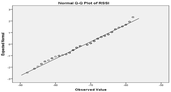 The expected and the observed distribution value follow the same trend as seen in Figure 11. The normal distribution of the sample value is verified using the Shapiro-Wilk test. The p-value of the Shapiro-Wilk test is 0.0593 suggesting that the values are normally distributed, and the null hypothesis is accepted. It is also observed that the RSSI variation within the underground mine model has a standard deviation of 6.79 dB.