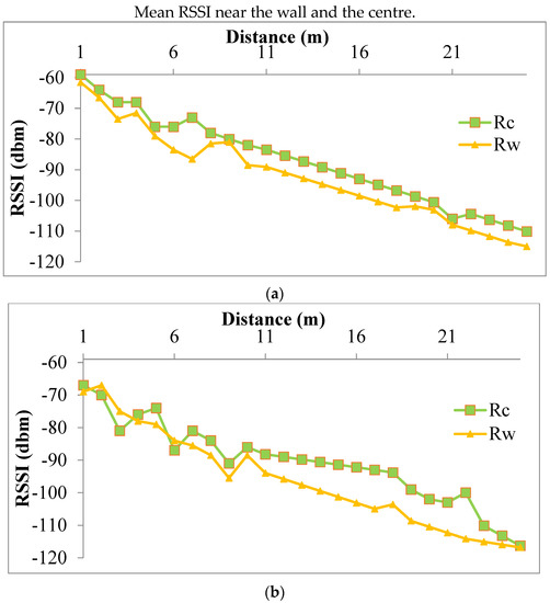 From Figure 12a–c, when the distance between the transmitter and receiver increases, it is seen that the RSSI tends to decrease and in between, there are some variabilities in the RSSI because of the presence of rough surfaces, bulges of the drive and because of the interference of the metal arch supports and metal doors. For the transmitter placed at the centre of the drive, the RSSI was observed for all three positions i.e., either side of the wall and at the centre of the drive as shown in Figure 12a. For the transmitter placed on the outer and inner sides of the wall, the RSSI was measured for the three positions of the drive as shown in Figure 12b and Figure 12c respectively. Figure 12a–c were compared to determine the best location for the receiver and the transmitter in the drive. It was found that the signal attenuation is lower when the receiver and transmitter is at the centre as compared to when it is near the walls.
