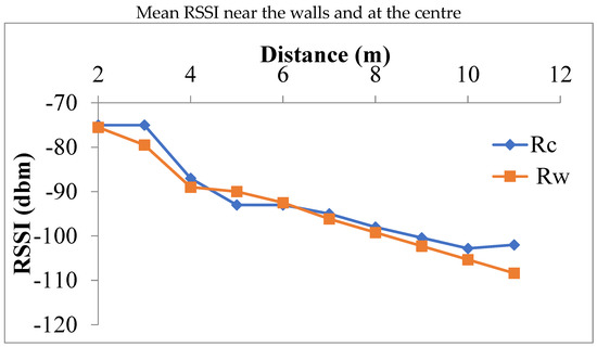 The effect of the position within the mine model must be determined. To do this, two groups of analytical measurements are created: those near the wall and those at the centre. For each distance, 3 measurements were made across the drive at 0.3 m from the outer and inner walls and at 1.1 m from both walls forming the centre of the drive. The average of each measurement at each distance was then calculated. The average RSSI is shown in Figure 12 both at the centre and near the wall.