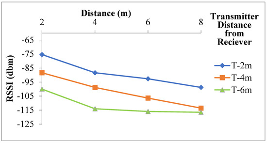 The final set of RSSI reading were observed at a junction by positioning the transmitter at 2 m, 4 m and 6 m from the junction at the center of the drive. According to the findings, the signal intensity decreases as the receiver moves near the wall. It is also observed that the signal intensity decreases as the distance between the transmitter and the receiver increases as shown in Figure 15. It is also observed that the position of transmitter does not have much influence on RSSI reading as shown in Figure 15.