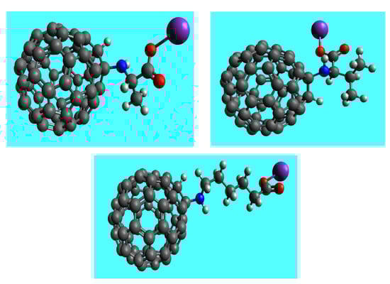 Structural formulas: H-C60-L-Ala-OK (left), H-C60-D-Val-C60-OK (right), H-C60-ε-ACA-OK (bottom). Black spheres—C; grey spheres—H; blue spheres—N; red spheres—O; purple spheres—K+.