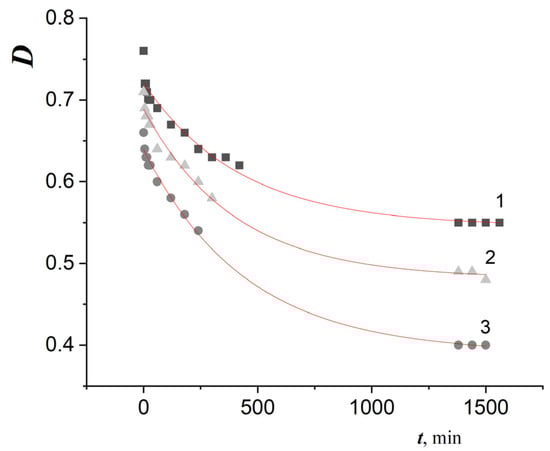 The dynamics of DPPH optical density decrease at a wavelength of 517 nm in the course of adding water–ethanol extracts of mushroom mycelium grown in the dark on medium A for 15 days, at a temperature of 25 °C. 1—with 0.8 mL of F. velutipes extract, 2—with 0.5 mL of L. sulphureus extract, 3—with 0.3 mL of G. applanatum extract. [DPPH]0 = 6.1 × 10−5 M, the reaction system volume is 3.6 mL.