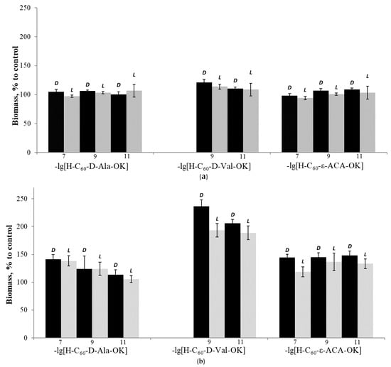 Since fullerene C60 is known as a compound capable of transferring photoexcitation energy to oxygen [,], the experiments were conducted to elucidate the role of light in the biostimulating properties of fullerene C60 and its amino acid derivatives when growing the basidiomycetes. These experiments were carried out at the following parameters of submerged cultivation: mode D—for 15 days at 25 °C in the dark; mode L—for 15 days at 25 °C under the natural 11-hour lighting per day in the laboratory room.