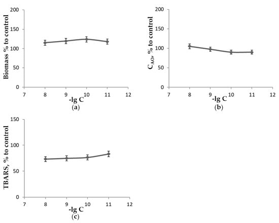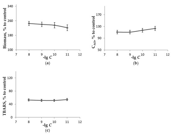 The influence of H-C60-D-Ala-OK concentration when growing L. sulphureus on medium A in the absence of light for 18 days at 25 °C upon the measured parameters as a percentage of control: (a)—biomass of mycelium; (b)—concentration of low-molecular-weight antioxidants extractable with 70% ethanol; (c)—concentration of TBARS extractable with 70% ethanol.