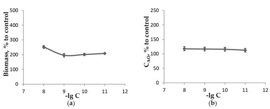 The observed growth-stimulating effects of hydrated fullerene C60 and its amino acid derivatives were not downregulated appreciably by varying their concentration in culture medium from 10−7 to 10−11 M (Figure 4, Figure 5 and Figure 6).