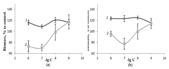 Biomass of mycelium as a percentage of control when growing F. velutipes in the absence of light for 15 days at 25 °C: 1—on medium A, 2—on medium B, supplemented with different concentrations of H-C60-D-Ala-OK (a) and H-C60-ε-ACA (b).