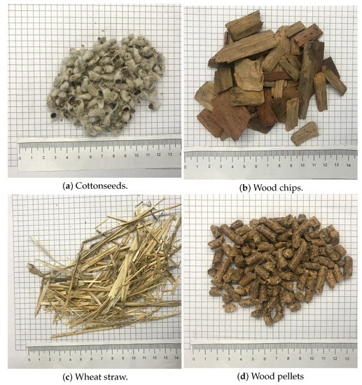 Material used in the study: cottonseeds, wood chips, wheat straw, and wood pellets.