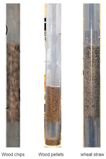 According to the existing literature, the reported bulk densities for cottonseed [41], wood chips [42], wood pellets [43], and wheat straw [44] range from 290 to 350, 200 to 250, 600 to 750, and 50 to 150 kg/, respectively. In this context, the actual bulk density of the selected biomass materials was ascertained using a method involving the introduction of the different weights of each material into a vertical pipeline, followed by the computation of the average bulk density in relation to the height of the formed bed. The bulk density, particle morphology, and dimensions (length and width) of the biomass materials used in our research are detailed in Table 1.